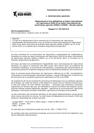 Il s'agit d'un déplacement d'élus membres de la Commission de l'Agriculture, accompagnés de fonctionnaires, pour se rendre au Salon International de l'Agriculture (SIA) et au Salon International du Machinisme Agricole (SIMA) à PARIS, les 27 et 28 février 2013, à l'invitation de la Chambre d'Agriculture du Bas-Rhin.
