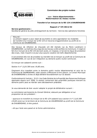 Le présent rapport a pour objet de soumettre à votre approbation les modalités de transfert d'un tronçon de la RD 124 en traverse d'agglomération au profit de la Commune de DAUBENSAND.