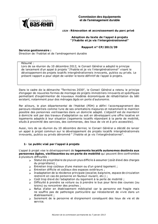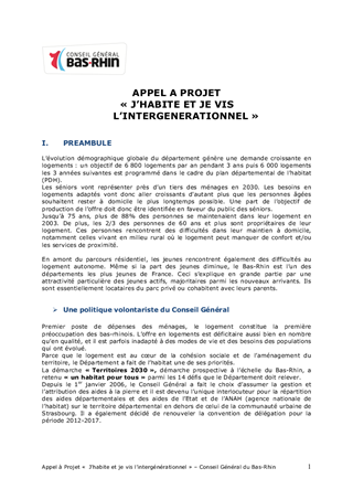 Lors de sa réunion du 10 décembre 2012, le Conseil Général a adopté le principe de lancement d'un appel à projets ''J'habite et je vis l'intergénérationnel'' visant le développement de projets locatifs intergénérationnels innovants, publics ou privés. Le présent rapport a pour objet de valider le texte définitif de l'appel à projets.