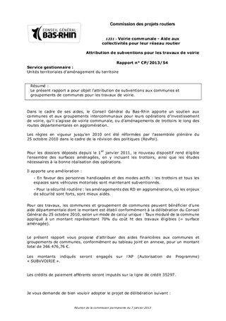 Le présent rapport a pour objet l'attribution de subventions aux communes et groupements de communes pour les travaux de voirie.