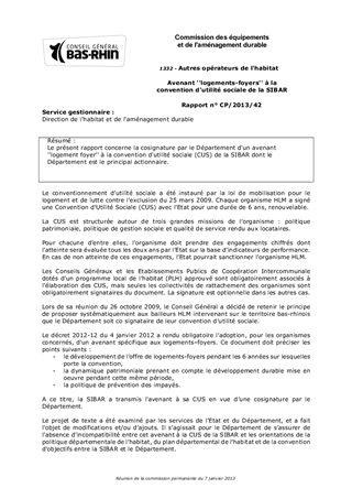 Le présent rapport concerne la cosignature par le Département d'un avenant ''logement foyer'' à la convention d'utilité sociale (CUS) de la SIBAR dont le Département est le principal actionnaire.