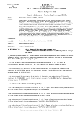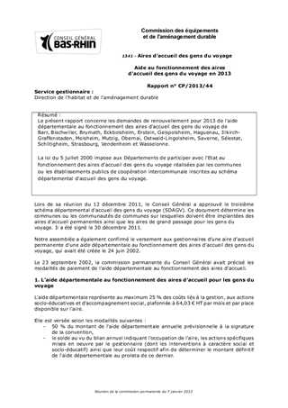 Le présent rapport concerne les demandes de renouvellement pour 2013 de l'aide départementale au fonctionnement des aires d'accueil des gens du voyage de Barr, Bischwiller, Brumath, Eckbolsheim, Erstein, Geispolsheim, Haguenau, Illkirch-Graffenstaden, Molsheim, Mutzig, Obernai, Ostwald-Lingolsheim, Saverne, Sélestat, Schiltigheim, Strasbourg, Vendenheim et Wasselonne. La loi du 5 juillet 2000 impose aux Départements de participer avec l'Etat au fonctionnement des aires d'accueil des gens du voyage réalisées par les communes ou les établissements publics de coopération intercommunale inscrites au schéma départemental d'accueil des gens du voyage.