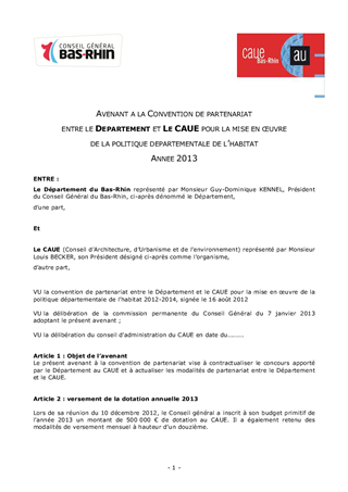 Conseil d'architecture, d'urbanisme et de l'environnement (CAUE) du Bas-Rhin - Avenant relatif à l'année 2013 de la convention de partenariat 2012-2014
