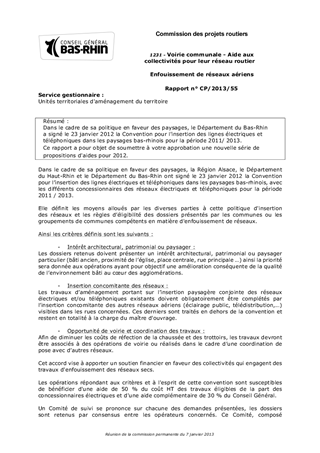 Dans le cadre de sa politique en faveur des paysages, le Département du Bas-Rhin a signé le 23 janvier 2012 la Convention pour l'insertion des lignes électriques et téléphoniques dans les paysages bas-rhinois pour la période 2011/ 2013. Ce rapport a pour objet de soumettre à votre approbation une nouvelle série de propositions d'aides pour 2012.