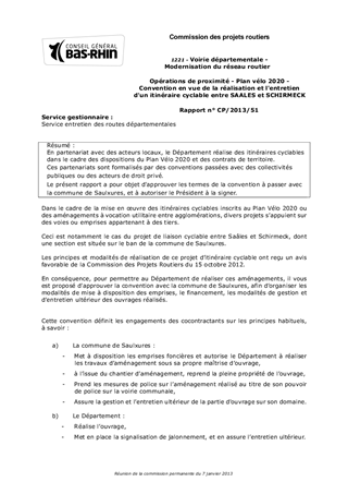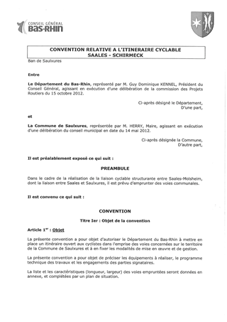 En partenariat avec des acteurs locaux, le Département réalise des itinéraires cyclables dans le cadre des dispositions du Plan Vélo 2020 et des contrats de territoire. Ces partenariats sont formalisés par des conventions passées avec des collectivités publiques ou des acteurs de droit privé. Le présent rapport a pour objet d'approuver les termes de la convention à passer avec la commune de Saulxures, et à autoriser le Président à la signer.
