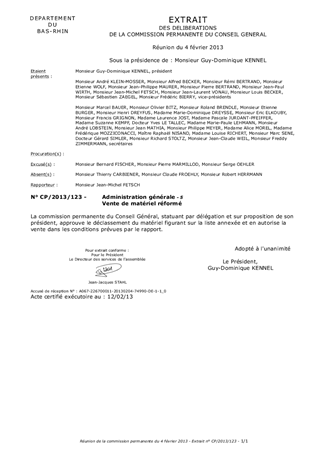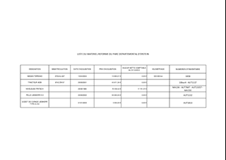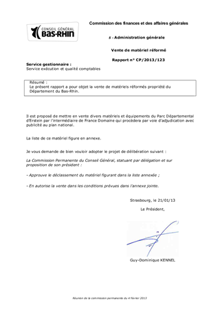 Vente de matériel réformé Resumé Le présent rapport a pour objet la vente de matériels réformés propriété du Département du Bas-Rhin. Pièces jointes Délibération Rapport 2 MATERIEL PARC ERSTEIN CPCG FEVR2013.pdf Assemblée : Commission Permanente Date : 04/02/2013 Rapporteur : Monsieur Jean-Michel FETSCH Collectivité : Conseil départemental du Bas-Rhin Direction : Direction des finances et de la commande publique Service : Service exécution et qualité comptables Domaine : Non renseigné Commission : M - Commission des finances et des affaires générales