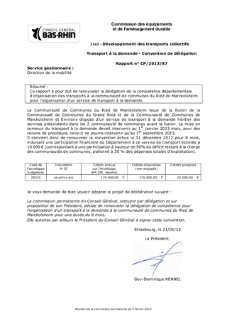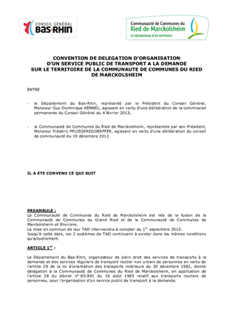 Ce rapport a pour but de renouveler la délégation de la compétence départementale d'organisation des transports à la communauté de communes du Ried de Marckolsheim pour l'organisation d'un service de transport à la demande.