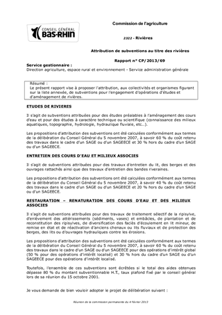 Le présent rapport vise à proposer l'attribution, aux collectivités et organismes figurant sur la liste annexée, de subventions pour l'engagement d'opérations d'études et d'aménagement de rivières.