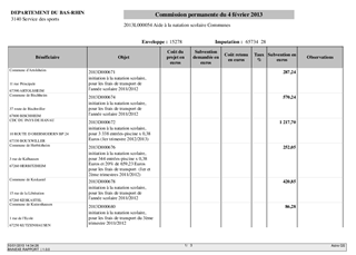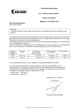 Aide à la natation Resumé Le présent rapport a pour objet de soumettre à votre approbation les aides au sport scolaire. Pièces jointes Délibération Rapport 3313 Natation communes.pdf 3313 Natation coopératives.pdf Assemblée : Commission Permanente Date : 04/02/2013 Rapporteur : Monsieur Sébastien ZAEGEL Collectivité : Conseil départemental du Bas-Rhin Direction : Direction de la jeunesse et des sports Service : Service des sports Domaine : Non renseigné Commission : K - Commission des sports
