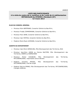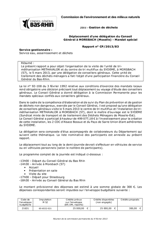 Le présent rapport a pour objet l'organisation de la visite de l'unité de tri-méthanisation METHAVALOR et du centre de tri multiflux du SYDEME, à MORSBACH (57), le 5 mars 2013, par une délégation de conseillers généraux. Cette unité de traitement des déchets ménagers a fait l'objet d'une participation financière du Conseil Général du Bas-Rhin.