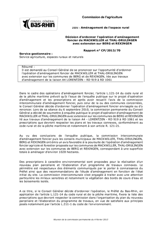 Il est demandé au Conseil Général de se prononcer sur l'opportunité d'ordonner l'opération d'aménagement foncier de MACKWILLER et THAL-DRULINGEN avec extension sur les communes de BERG et de REXINGEN, liée aux travaux d'aménagement de la liaison A4 LORENTZEN - RD 919 à RD 1061