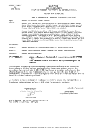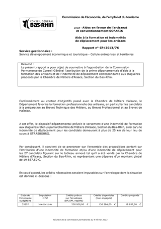 Le présent rapport a pour objet de soumettre à l'approbation de la Commission Permanente du Conseil Général l'attribution de la prime départementale d'aide à la formation des artisans et de l'indemnité de déplacement correspondante aux stagiaires proposés par la Chambre de Métiers d'Alsace, Section du Bas-Rhin.