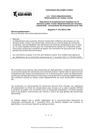Le Département peut autoriser d'autres collectivités à effectuer des travaux sur son domaine public routier. Ces collectivités, communes ou communautés de communes en général, peuvent bénéficier des attributions du fonds de compensation pour la taxe sur la valeur ajoutée (FCTVA) pour les investissements réalisés sur le domaine public d'une autre collectivité à condition de passer une convention tel que prévu par le code général des collectivités territoriales. Les conventions à passer à ce titre sont établies à partir d'un modèle-type approuvé par délibération de la commission permanente du 7 novembre 2011 (n° CP/2011/825).