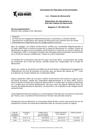 Au titre de son engagement départemental pour la jeunesse, le Conseil Général subventionne l'organisation des classes de découverte que réalisent tant les écoles élémentaires et maternelles que les collèges publics et privés.