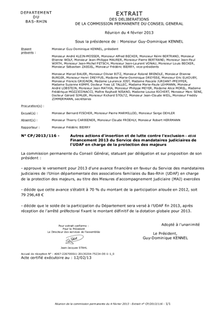 Le Conseil Général du Bas-Rhin participe au financement des mesures d'accompagnement judiciaire exercées par l'Union Départementale des Associations Familiales du Bas-Rhin (UDAF). Cette participation découle des dispositions de la loi 2007-308 du 5 mars 2007 portant réforme de la protection juridique des majeurs (CASF Livre III-titre VI-Article L361-1). Afin de permettre à l'UDAF de mieux gérer sa trésorerie en 2013, il est proposé de lui accorder une avance de 70% du montant versé en 2012.