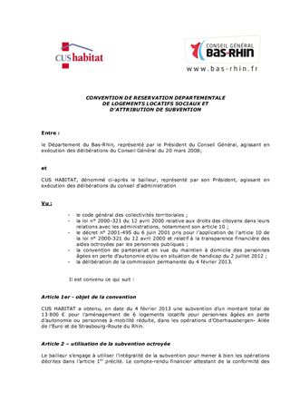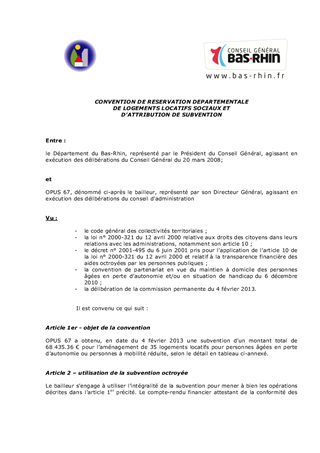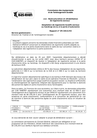 Le présent rapport concerne les demandes d'aide financière présentées par CUS Habitat et OPUS 67 concernant la réhabilitation de logements locatifs adaptés au handicap et /ou à la perte d'autonomie dans le cadre de leur convention relative à l'adaptation des logements à la perte autonomie.