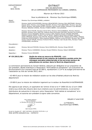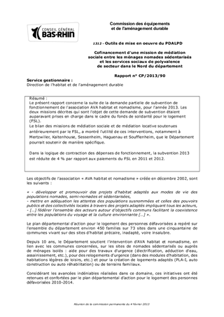 Le présent rapport concerne la suite de la demande partielle de subvention de fonctionnement de l'association AVA habitat et nomadisme, pour l'année 2013. Les deux missions décrites qui sont l'objet de cette demande de subvention étaient auparavant prises en charge dans le cadre du fonds de solidarité pour le logement (FSL). Le bilan des missions de médiation sociale et de médiation locative soutenues antérieurement par le FSL, a montré l'utilité de ces interventions, notamment à Mertzwiller, Kaltenhouse, Sessenheim, Haguenau et Soufflenheim, que le Département pourrait soutenir de manière spécifique. Dans la logique de contraction des dépenses de fonctionnement, la subvention 2013 est réduite de 4 % par rapport aux paiements du FSL en 2011 et 2012.