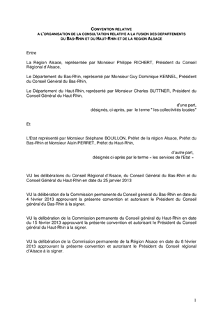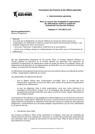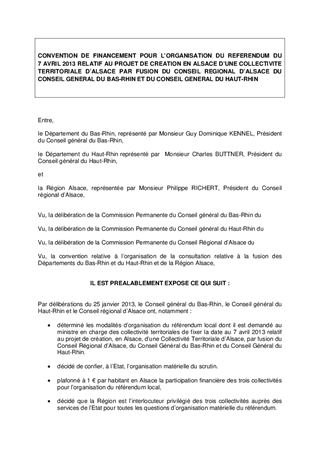 A la suite de la délibération du Conseil Général du 25 janvier 2013 portant sur l'organisation du référendum relatif au projet de Collectivité Territoriale d'Alsace, il est proposé d'approuver deux conventions : - l'une avec l'Etat pour l'organisation matérielle de la consultation ; - l'autre avec la Région Alsace et le Département du Haut-Rhin pour le financement du référendum.