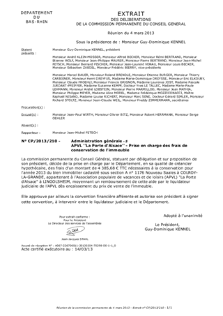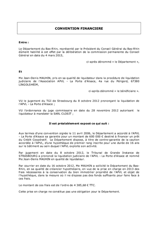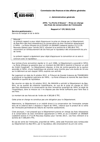 Le présent rapport a pour objet d'approuver la prise en charge par le Département du Bas-Rhin des frais nécessaires à la conservation du bien immobilier appartenant à l'APVL - La Porte d'Alsace sis à COLROY LA GRANDE (cadastré section A n°1176 Nouveau Saales) pour l'année 2013, s'élevant à la somme de 4 385,68 € TTC, moyennant un remboursement de ces frais par le liquidateur dès encaissement du prix de vente. Le présent rapport a également pour objet d'approuver la convention en ce sens à conclure avec le liquidateur.