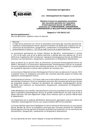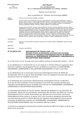 Il s'agit de se prononcer sur l'envoi en possession provisoire des nouvelles parcelles de l'opération d'aménagement foncier agricole et forestier de ROHR avec extension sur les communes de Duntzenheim, Gougenheim, Landersheim et Willgottheim-Woellenheim conformément à l'article L. 123-10 du code rural et de la pêche maritime.