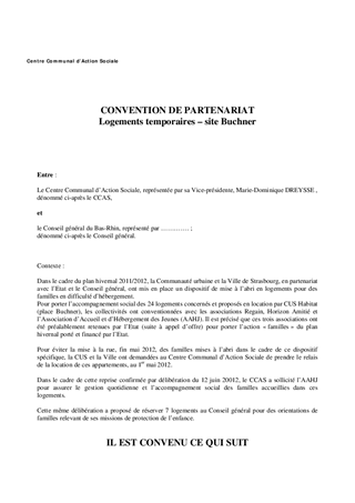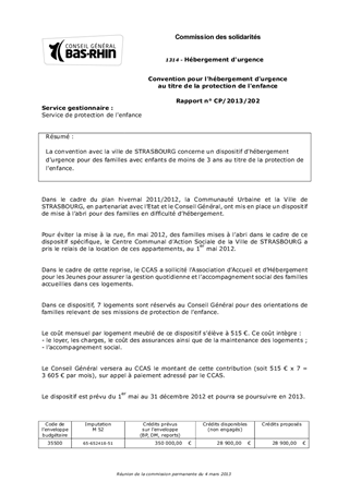 La convention avec la ville de STRASBOURG concerne un dispositif d'hébergement d'urgence pour des familles avec enfants de moins de 3 ans au titre de la protection de l'enfance.