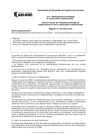 Le présent rapport a pour objet de soumettre à l'approbation de la Commission Permanente du Conseil Général diverses propositions d'aides départementales en faveur de l'hôtellerie familiale et de la restauration traditionnelle.