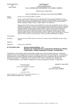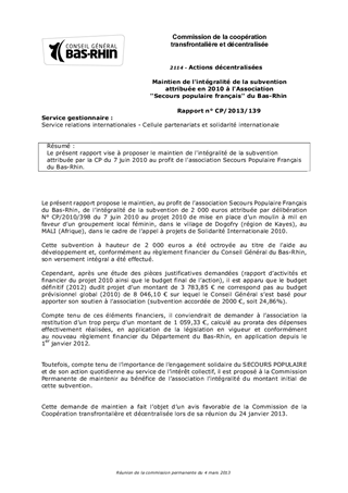 Le présent rapport vise à proposer le maintien de l'intégralité de la subvention attribuée par la CP du 7 juin 2010 au profit de l'association Secours Populaire Français du Bas-Rhin.