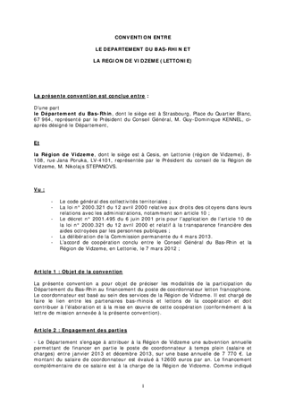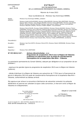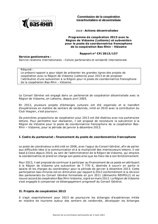 Le présent rapport a pour objet de présenter les grandes lignes des projets de coopération avec la Région de Vidzeme (Lettonie) pour 2013 et de proposer l'attribution d'une subvention à la Région pour le poste de coordonnatrice francophone de la coopération Bas-Rhin - Vidzeme.