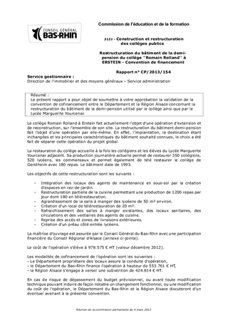 Le présent rapport a pour objet de soumettre à votre approbation la validation de la convention de cofinancement entre le Département et la Région Alsace concernant la restructuration du bâtiment de la demi-pension utilisé par le collège ainsi que par le Lycée Marguerite Yourcenar.
