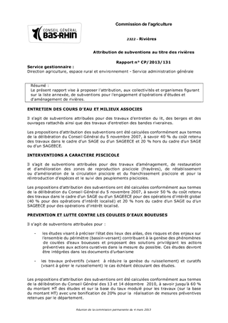Le présent rapport vise à proposer l'attribution, aux collectivités et organismes figurant sur la liste annexée, de subventions pour l'engagement d'opérations d'études et d'aménagement de rivières.