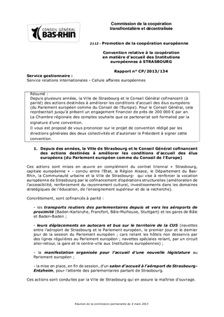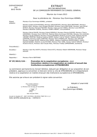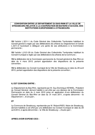Depuis plusieurs années, la Ville de Strasbourg et le Conseil Général cofinancent (à parité) des actions destinées à améliorer les conditions d'accueil des élus européens (du Parlement européen comme du Conseil de l'Europe). Pour le Conseil Général, cela représentait jusqu'à présent un engagement financier de près de 200 000 € par an. La Chambre régionale des comptes souhaite que ce partenariat soit formalisé par la signature d'une convention. Il vous est proposé de vous prononcer sur le projet de convention rédigé par les directions générales des deux collectivités et d'autoriser le Président à signer cette convention.