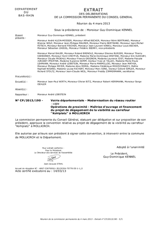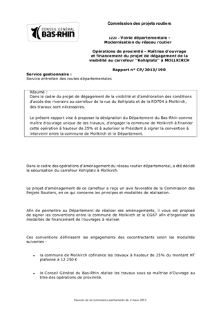 Dans le cadre du projet de dégagement de la visibilité et d'amélioration des conditions d'accès des riverains au carrefour de la rue du Kohlplatz et de la RD704 à Mollkirch, des travaux sont nécessaires. Le présent rapport vise à proposer la désignation du Département du Bas-Rhin comme maître d'ouvrage unique de ces travaux, d'engager la commune de Mollkirch à financer cette opération à hauteur de 25% et à autoriser le Président à signer la convention à intervenir entre la commune de Mollkirch et le Département.
