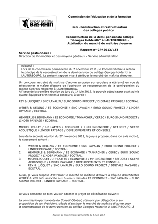 Lors de la commission permanente du 7 novembre 2011, le Conseil Général a retenu le principe de la reconstruction de la demi-pension du collège Georges Holderith à LAUTERBOURG. Le présent rapport vise à attribuer le marché de maîtrise d'oeuvre.