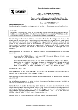 Le présent rapport a pour objet de procéder à la régularisation et à la répartition entre le Département du Bas-Rhin et la Communauté de Communes de l'UFFRIED des accès routiers à la zone d'activités du village des marques à ROPPENHEIM.
