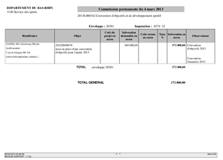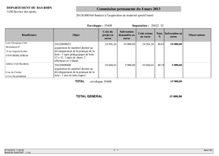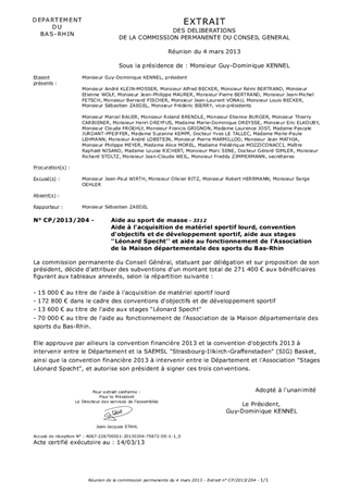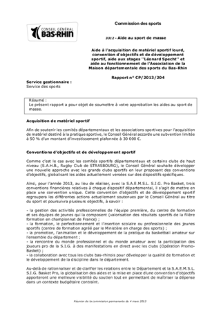 Aide à l'acquisition de matériel sportif lourd, convention d'objectifs et de développement sportif, aide aux stages ''Léonard Specht'' et aide au fonctionnement de l'Association de la Maison départementale des sports du Bas-Rhin