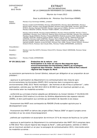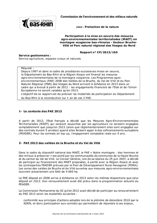 Depuis 1997 et dans le cadre de procédures successives mises en oeuvre, le Département du Bas-Rhin et la Région Alsace ont financé les mesures agro-environnementales de la montagne vosgienne. Les Programmes agro-environnementaux (PAE) 2008 des Vallées de la Bruche, du Val de Villé et du Parc Naturel Régional (PNR) des Vosges du Nord arrivent à échéance en 2013 dans un cadre qui a évolué à partir de 2012 : les engagements financiers de l'Etat et de l'Union Européenne ne seront valables qu'en 2013. L'objectif de ce rapport est de préciser les modalités de participation du Département du Bas-Rhin à la reconduction sur 1 an de ces 2 PAE.