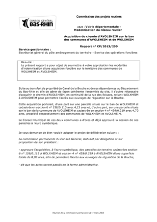 Le présent rapport a pour objet de soumettre à votre approbation les modalités d'indemnisation d'une acquistion foncière sur le territoire des communes de WOLXHEIM et AVOLSHEIM.