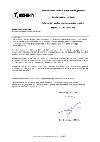 Le présent rapport a pour objet d'informer la commission permanente de la conclusion des marchés publics décrits dans le tableau joint en annexe, et qui correspondent à la mise en oeuvre de programmes et d'opérations identifiés dans le budget départemental.