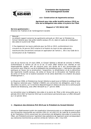 Le présent rapport concerne les agréments octroyés en 2012 par le Président du Conseil Général pour des prêts locatifs sociaux (P.L.S.) dans le cadre de la délégation des aides à la pierre de l'Etat. Il fixe également les loyers plafonds pour les PLS en 2013, conformément à la circulaire du 24 janvier 2013 relative à la fixation du loyer et des redevances maximums des conventions conclues en application de l'article L. 351-2 du Code de la Construction et de l'habitation.