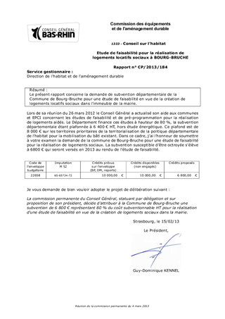 Le présent rapport concerne la demande de subvention départementale de la Commune de Bourg-Bruche pour une étude de faisabilité en vue de la création de logements locatifs sociaux dans l'immeuble de la mairie.