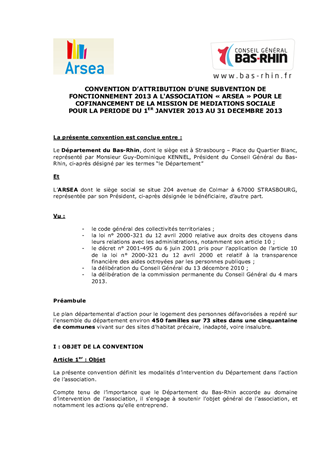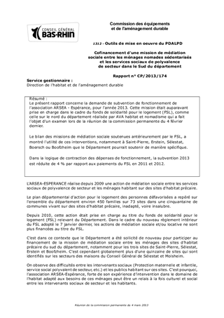 Le présent rapport concerne la demande de subvention de fonctionnement de l'association ARSEA - Espérance, pour l'année 2013. Cette mission était auparavant prise en charge dans le cadre du fonds de solidarité pour le logement (FSL), comme celle sur le nord du département réalisée par AVA habitat et nomadisme qui a fait l'objet d'un examen lors de la réunion de la commission permanente du 4 février dernier. Le bilan des missions de médiation sociale soutenues antérieurement par le FSL, a montré l'utilité de ces interventions, notamment à Saint-Pierre, Erstein, Sélestat, Boersch ou Boofzheim que le Département pourrait soutenir de manière spécifique. Dans la logique de contraction des dépenses de fonctionnement, la subvention 2013 est réduite de 4 % par rapport aux paiements du FSL en 2011 et 2012.
