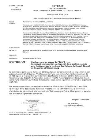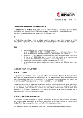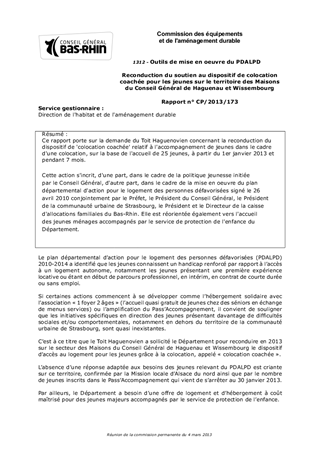Ce rapport porte sur la demande du Toit Haguenovien concernant la reconduction du dispositif de 'colocation coachée' relatif à l'accompagnement de jeunes dans le cadre d'une colocation, sur la base de l'accueil de 25 jeunes, à partir du 1er janvier 2013 et pendant 7 mois. Cette action s'incrit, d'une part, dans le cadre de la politique jeunesse initiée par le Conseil Général, d'autre part, dans le cadre de la mise en oeuvre du plan départemental d'action pour le logement des personnes défavorisées signé le 26 avril 2010 conjointement par le Préfet, le Président du Conseil Général, le Président de la communauté urbaine de Strasbourg, le Président et le Directeur de la caisse d'allocations familiales du Bas-Rhin. Elle est réorientée également vers l'accueil des jeunes ménages accompagnés par le service de protection de l'enfance du Département.