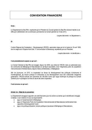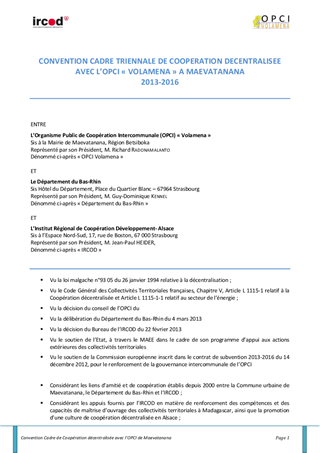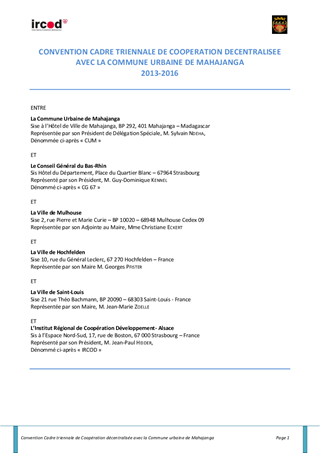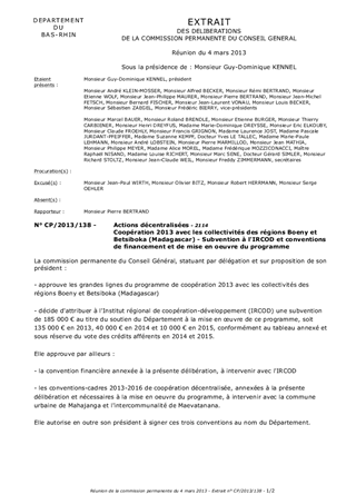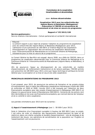 Le présent rapport a pour objet de proposer l'adoption du programme de coopération avec les collectivités des régions Boeny et Betsiboka (Madagascar) pour 2013, l'attribution d'une subvention de 185 000 € à l'Institut Régional de Coopération-Développement et l'approbation des conventions de coopération décentralisée avec l'Intercommunalité de Maevatanana et la Commune Urbaine de Mahajanga, nécessaires pour la mise en oeuvre de ce programme.