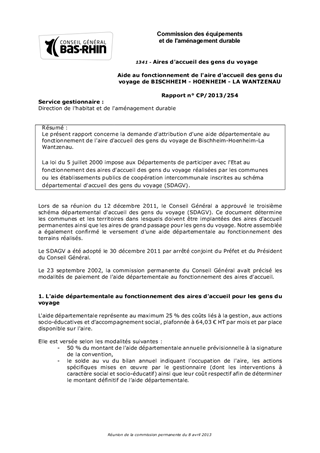 Le présent rapport concerne la demande d'attribution d'une aide départementale au fonctionnement de l'aire d'accueil des gens du voyage de Bischheim-Hoenheim-La Wantzenau. La loi du 5 juillet 2000 impose aux Départements de participer avec l'Etat au fonctionnement des aires d'accueil des gens du voyage réalisées par les communes ou les établissements publics de coopération intercommunale inscrites au schéma départemental d'accueil des gens du voyage (SDAGV).