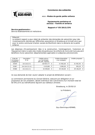Le présent rapport a pour objet de présenter des demandes de subvention pour des investissements réalisés par différentes associations à Strasbourg et Urmatt ainsi que pour le centre communal d'action sociale de Bischheim dans le domaine de la petite enfance