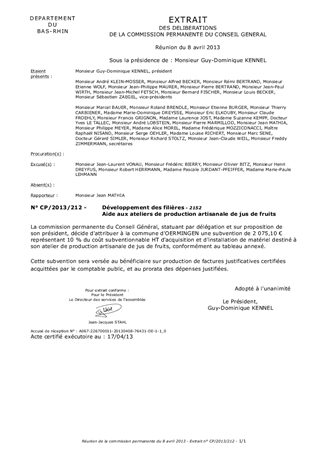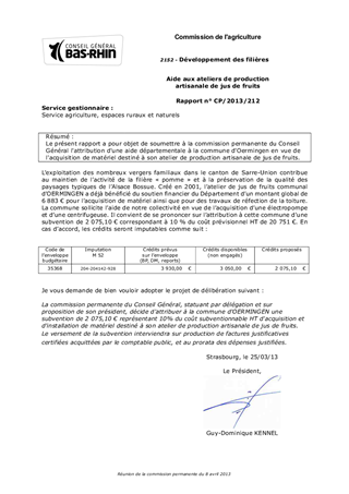 Le présent rapport a pour objet de soumettre à la commission permanente du Conseil Général l'attribution d'une aide départementale à la commune d'Oermingen en vue de l'acquisition de matériel destiné à son atelier de production artisanale de jus de fruits.