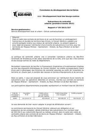 Dans le cadre des contrats de territoire et en vue de favoriser un aménagement harmonieux et durable du territoire bas-rhinois, le Conseil Général a adopté une priorité partagée relative aux enjeux de centralité urbaine. Le présent rapport a pour objet de proposer l'attribution d'une tranche de subventions à ce titre, pour les territoires de l'Espace Rhénan - Gambsheim - Kilstett, du Pays d'Erstein et de Barr-Bernstein.