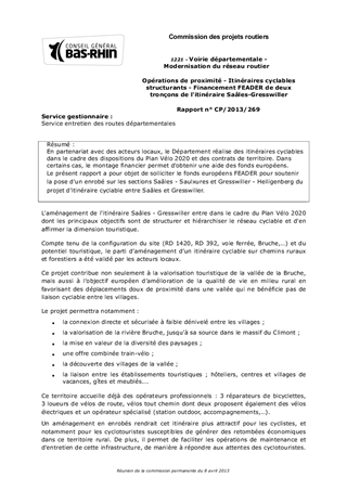 En partenariat avec des acteurs locaux, le Département réalise des itinéraires cyclables dans le cadre des dispositions du Plan Vélo 2020 et des contrats de territoire. Dans certains cas, le montage financier permet d'obtenir une aide des fonds européens. Le présent rapport a pour objet de solliciter le fonds européens FEADER pour soutenir la pose d'un enrobé sur les sections Saâles - Saulxures et Gresswiller - Heiligenberg du projet d'itinéraire cyclable entre Saâles et Gresswiller.