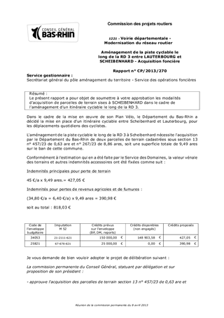 Le présent rapport a pour objet de soumettre à votre approbation les modalités d'acquisition de parcelles de terrain sises à SCHEIBENHARD dans le cadre de l'aménagement d'un itinéraire cyclable le long de la RD 3.