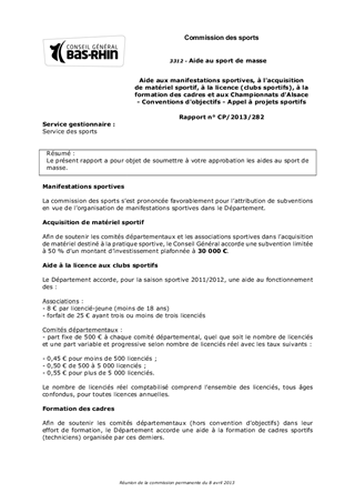 Le présent rapport a pour objet de soumettre à votre approbation les aides au sport de masse.